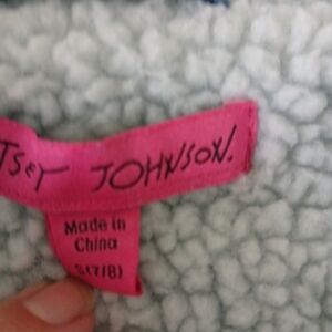 Stylish blue faux denim jacket for kids by Betsey Johnson. Features playful embroidered details and sequined hearts for a fun look. Sherpa lined, button up . Girl's size 7/8.