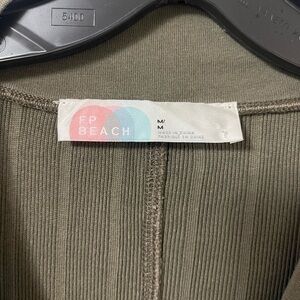 Chic khaki dress with ribbed texture. Features long sleeves and button details. Perfect for versatile styling.