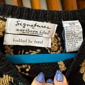 Signatures hand knitted northern isles, big cat sweater. This is a heavy oversized sweater. 22“ pit to pit. 30” long. Tunic length. Passing through a dog friendly house.