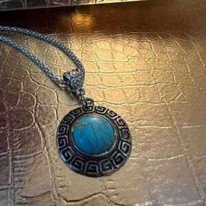 Elegant turquoise pendant necklace with intricate silver detailing. Perfect for adding a touch of color and sophistication to any outfit.