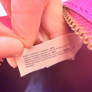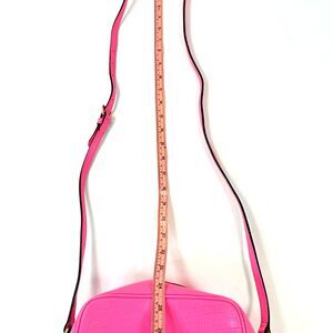 Stand out with this vibrant hot pink purse. It features a textured lizard embossed leather finish and a signature gold tone logo plate. The adjustable crossbody strap ensures a comfortable fit for daily wear. Perfect for adding a pop of color to any outfit.
