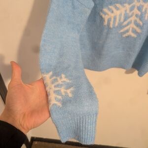 Chic light blue sweater with a white snowflake pattern. Ideal for winter warmth.