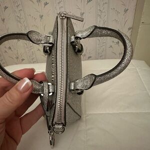 Elegant mini bag with a silver metallic finish. Features top handles and a detachable strap. Like new with no callouts. Clean inside and out. 8”W x 5.5”H x 3”D