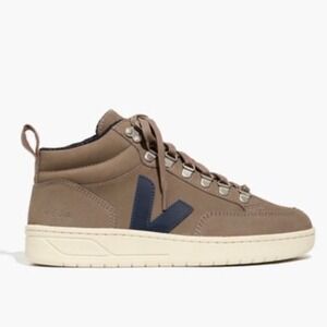 Discover adventure-ready style with these Veja Roraima high-top sneakers. Crafted with a premium taupe suede, these sneakers feature the iconic navy V logo, adding a touch of sophisticated contrast. The sturdy construction and lace-up front ensure a secure and comfortable fit, while the pull tab at the heel makes them easy to slip on and off. Perfect for exploring city streets or enjoying a casual weekend outing, these versatile high-tops elevate any ensemble.
