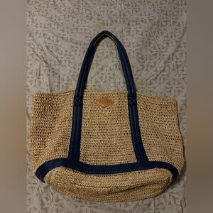 Rafia women tote with navy accents. Inside pocked and key attachment.