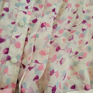 Pleated peplum blouse with cap sleeves, front pleats with cute buttons. Material contents are pictured and though labeled a size small it seems to run big and feels more like a medium.