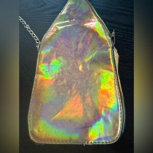 This fun RARE piece features a unique holographic crossbody bag shaped like a bottle with marks to look like tears and has a chain strap for the crossbody. Perfect for special events like concerts, Coachella, raves and all events that have a creative edge.