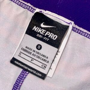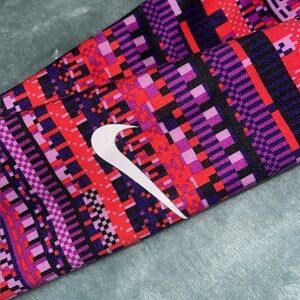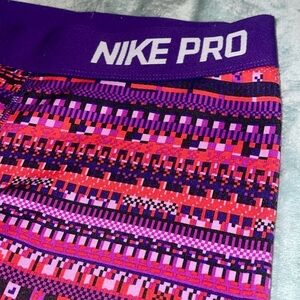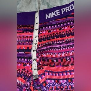 Nike Pro leggings women’s small, multicolor geometric print leggings, Nike Dri-FIT workout tights, athletic leggings for women, pink purple orange Nike leggings