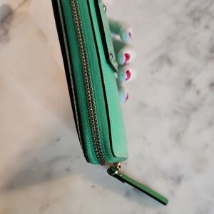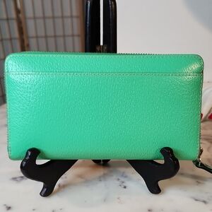 Chic mint green wallet by Kate Spade. Features a zip-around design with a stylish logo plaque.