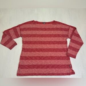 Soft and lightweight T by Talbots striped knit top in a warm red tone. Features decorative buttons along the shoulders and sleeves for a classic nautical-inspired look. Relaxed fit with side slits for comfort and easy movement.