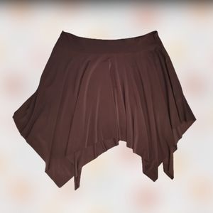 This cute chocolate brown skirt features a pixie hem with a comfortable elastic waist in the back and a flattering flat front. Material has some stretch. Hits right around knee length, depending on your height.