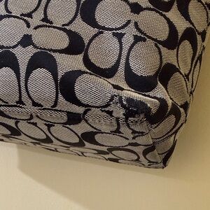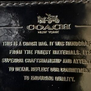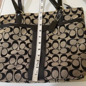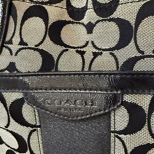 Stylish Canvas and Patent Leather trim Coach shoulder bag with iconic pattern. Black and tan design. Perfect for daily use.