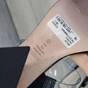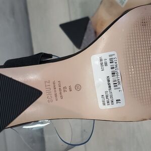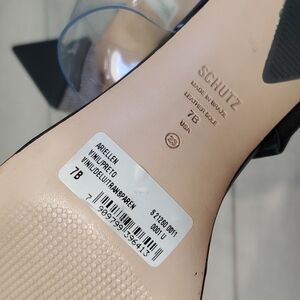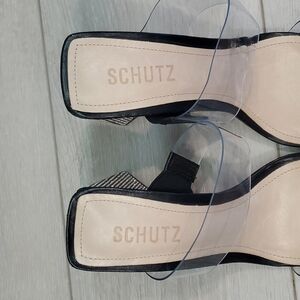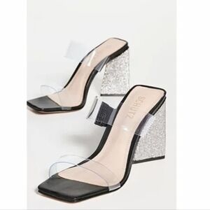 Schutz Ariellen Vinyl Crystal Embellished Heels Color: Black Style #SCHUT31219 Angular, crystal-encrusted heels up the eye-catching factor of these Schutz mules, which feature transparent-vinyl straps for a sleek look. Fabric: Vinyl Leather footbed Crystal-encrusted block heel Open toe Leather sole with rubber heel cap