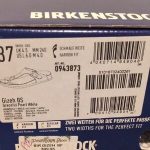 Stylish Birkenstock Gizeh sandals. Cream straps with brown footbed. Ideal for everyday wear.
