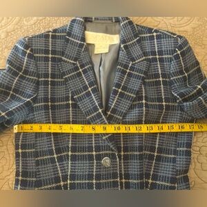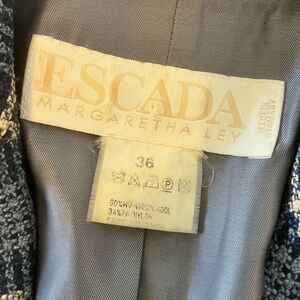 This vintage blazer is simply stunning! Sophisticated blue plaid blazer by Escada. Features a tailored fit, classic design and the timeless style and quality of Escada. Blue and silver Double E Escada logo buttons at the front and on the cuffs. Dress it up for work over a navy blue pencil skirt, or dress up your favorite jeans with it! It looks spectacular with jeans! This 40 year old blazer is in very nice vintage condition. I loved this jacket and it is almost painful for me to give it up! But I retired last year and I am letting go of some of my nicer pieces.