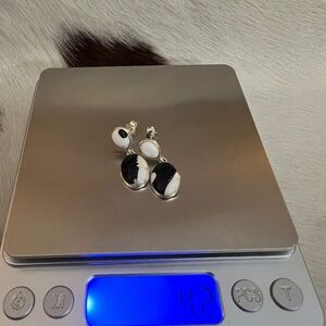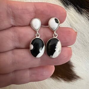 For your consideration is this pair of handcrafted dangle earrings crafted from sterling silver and feature striking white buffalo stones, which is a rare mineral combination of calcite and iron found in Nevada. Each earring is a two-piece design, with a smaller teardrop stone at the top and a larger oval stone dangling below, connected by a silver link. The stones are set in smooth, polished silver bezels with an open back design and exhibit a distinct, high-contrast black and white matrix pattern, making each piece unique. The overall aesthetic is consistent with Native American, specifically Navajo, jewelry designs.