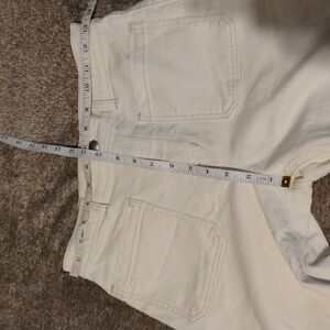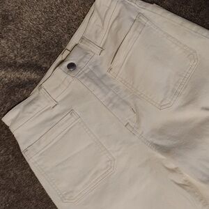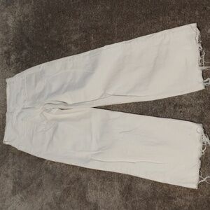 Wide leg raw hem jeans with front and back patch pockets. Zipper and button closure.
