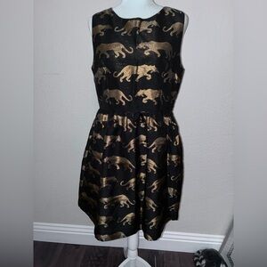 Anthropologie EyeDoll Black cocktail Dress Gold Leopard Pattern 12 Fit Flare