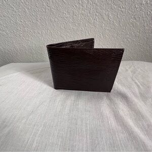Classic, well-made bi-fold wallet by Prince Gardner, crafted from genuine pigskin leather with a rich brown embossed, reptile-style texture. The exterior is unbranded, giving it a clean, timeless look, while the interior features Prince Gardner’s gold branding.