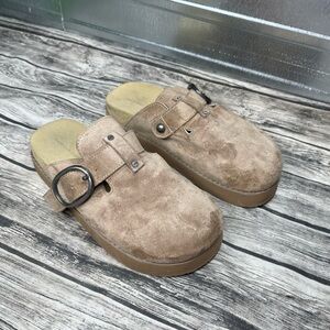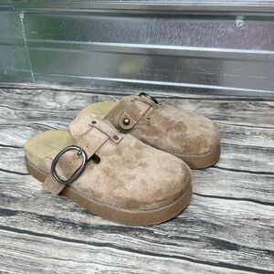 American Eagle Tan Faux Suede Slip On Clogs Western Buckle Womens Platform