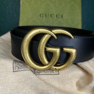 Authentic Gucci Marmont Double G leather belt in black with antique gold hardware, size small. Purchased in store at the Gucci boutique inside Saks Fifth Avenue at The Galleria in Houston, TX.
