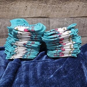 Pack of 12 (24 socks) brand new Hello Kitty "Be Yourself" socks for girls. Socks measure about 6", best for ages 3 to 6. Socks are a bright turquoise blue with navy blue polka dots.