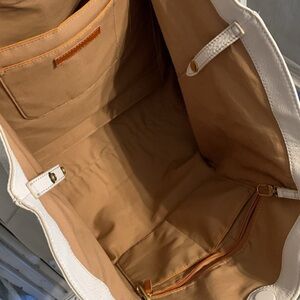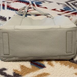 Hobo Kingston Large Tote. Soft pebbled leather. Beautiful powder white color. Perfect for year round use. Interior front has 1 zip pocket and 2 slip pockets. Interior back has padded tech slip pocket, slip pocket and pen pocket. Also has 2 fob hooks. Hidden magnetic top closure. Exterior back has signature smartphone pocket. Measures approximately: 14”H x 6”D x 23”W at widest point; 11” strap drop. This beauty has tons of space for all your essentials..you’ll love her. 100% Genuine Leather. So soft .. will not disappoint. Leather marks with age and there maybe a few age marks on this beauty. Slight markings on the tassels. EUC.