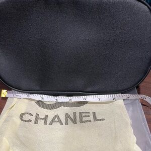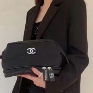 Sophisticated black toiletry bag by CHANEL. Features iconic logo and dual zippers. Ideal for travel.
