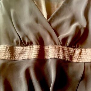 This new elegant evening dress features a flattering wrap design and delicate layered details. Brown satin waistband.