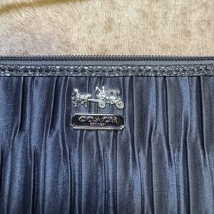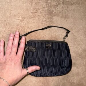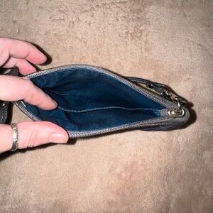 Stylish dark grey clutch with textured design. Features a wristlet strap attached to zipper. Dark blue inside. Minimal use. Perfect for evening outings.