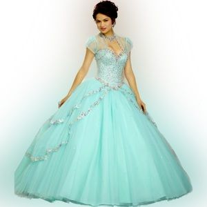 ๐Multi colored jewel beaded bodice on a tulle ball with a gown skirt with a sweep train and matching bolero. ๐