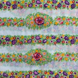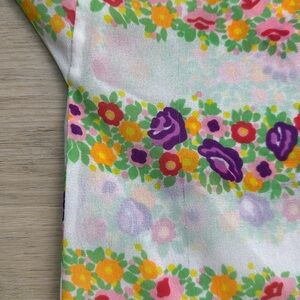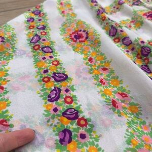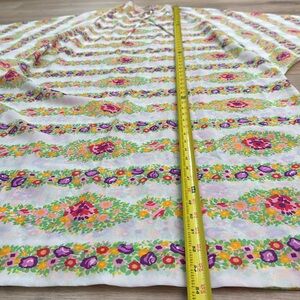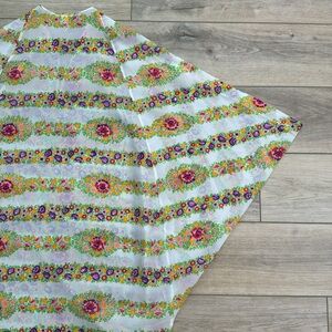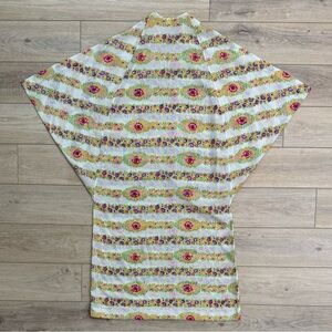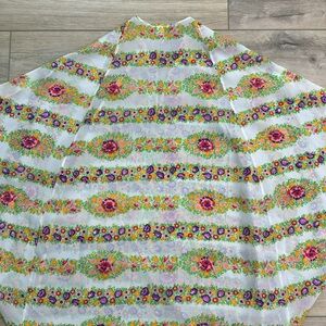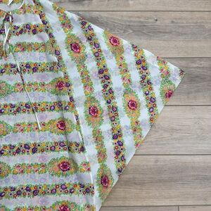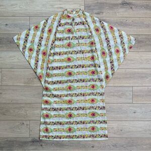 Absolutely stunning authentic 70s floral stripe kaftan maxi dress by Lord and Taylor. Casual mumu relaxed fit style with a seventies goddess multi color floral stripe on a cream background. The material is slightly sheer for a sexy silhouette effect, perfect to pair with a body suit or as a swimsuit coverup. Dolman sleeves for luxurious volume. Split neck with tie closure. Rare piece of vintage flower child high fashion. Two small spots where the fabric has runs as pictured, only noticeable upon close inspection. A Very forgiving size Medium M would fit a Large L too - See Measurements