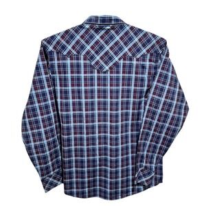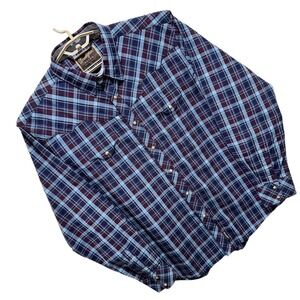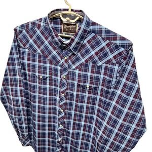 Keywords: Wrangler, Retro, Western shirt, Plaid shirt, Long sleeve, Button up, Mens shirt, XXL, Casual shirt, Cowboy shirt, Snap closure, Blue plaid, Burgundy plaid