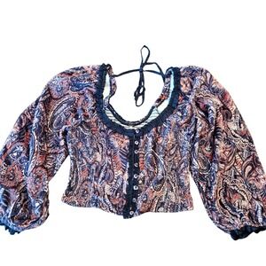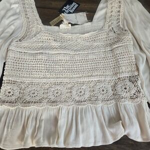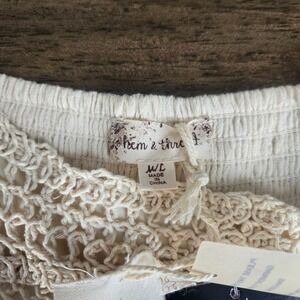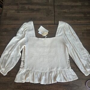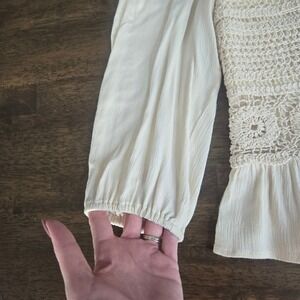 Hem & Thread Cream Crochet Lace Peasant Top Long Sleeve Boho Smocked Blouse M/L