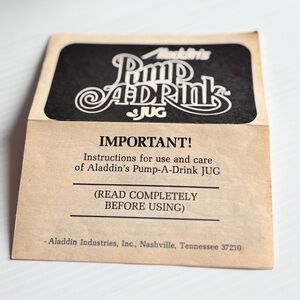 Jug is clean and in very good vintage condition. Pump mechanism present and intact. Original box shows visible wear, creasing, and surface damage consistent with age. Instruction booklet included and legible.