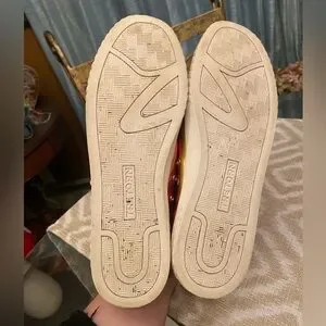 Iridescent rainbow colors wash over a low-top sneaker sporting iconic gullwings swooping down the sides and a bright white bumper cupsole. Sneakers feature: Lace-up style, Removable insole. Synthetic upper/textile lining/rubber sole. Please see photos for wear - there is some scuffing on one side. Otherwise overall very clean.