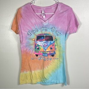 V-neck tie-dye t-shirt featuring a graphic of a Volkswagen van with "Put-in-Bay Ohio" t