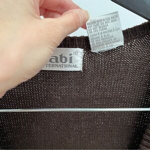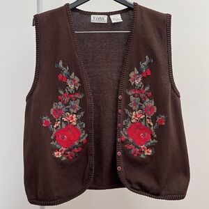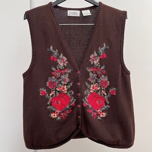 Vintage floral button up sweater vest L brown needlepoint cross stitch Tabi