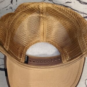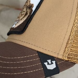 Stylish Goorin Bros hat with lion patch. Features tan front and brown brim. Mesh back for breathability.