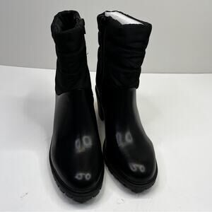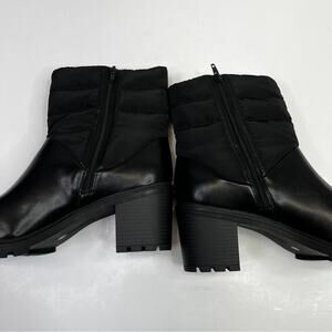Black Belcalise ankle boots from Alfani. Quilted puffer design around the ankle with a faux leather upper. Chunky rubber lug sole is rugged and weather ready. 3" block heel. Almond shaped toe with an inner ankle zipper for easy on and off. Cushioned insoles for added comfort. New in box - retail $110.