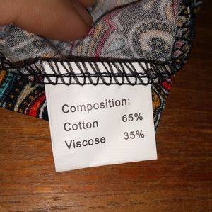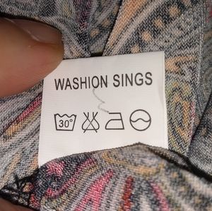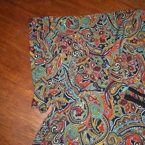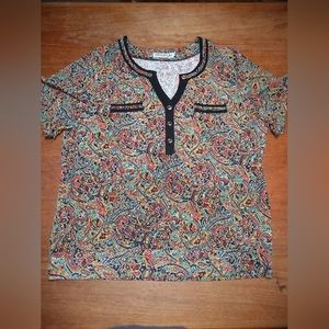 Women's short sleeve Zhong ni da (or Zhongnida) pullover shirt. Marked size 54 - I believe this is a Russian brand & sizing, which would make this a 1X. Notched V-neckline. Buttons are just for show and are non-functioning. Front pockets are also just decoration. Interesting multicolour paisley patterned material. Reminds me of the 1990s.