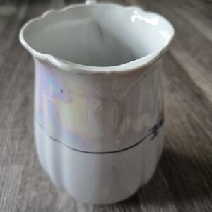 This antique Bavarian porcelain pitcher features a stunning iridescent lustre finish that creates a pearly rainbow sheen. The body displays a decorative floral cartouche of pink roses and purple blossoms against a ribbed, fluted texture. A delicate scalloped rim and elegant handle make this a perfect cottagecore centerpiece or functional milk jug.
