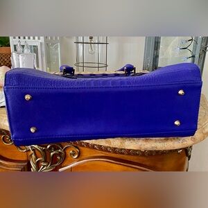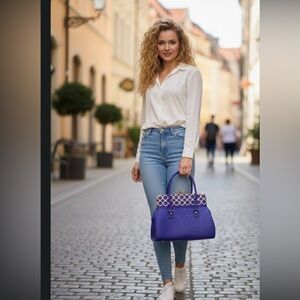 This stylish handbag features a vibrant purple color with luxurious gold accents. Perfect for adding a touch of elegance to any outfit. Very well made . Beautiful color and detail.