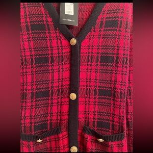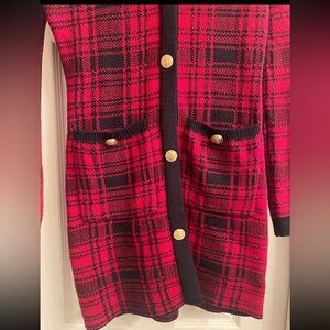 Elegant long sleeve dress with a striking red and black plaid pattern. Features a button-up front and stylish design.
