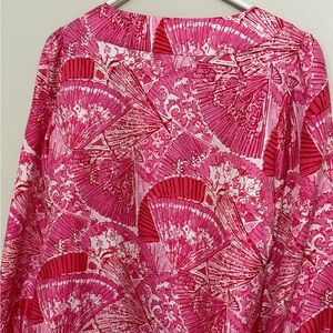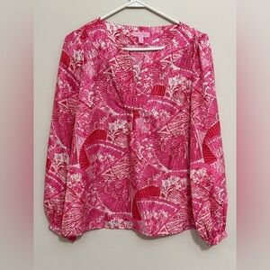 Lilly Pulitzer Womens Oversize XS 100% Silk Long Slv Top Pink Asian Fans Vibrant