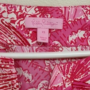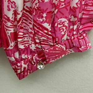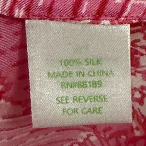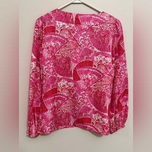 Lilly Pulitzer 100% silk top with long sleeves, v-neck, tunic style. Beautiful, vibrant pink design with Asian fans. Rhinestone detail at cuffs. Slight puff sleeves with elastic cuffs. Dry clean only.