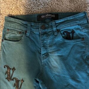 Stylish Teal Stacked Flare Jeans with Black Accents