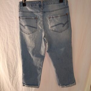 Light blue cropped jeans with classic five-pocket style, with very nice design stitching in the back pockets Comfortable and versatile for everyday wear.