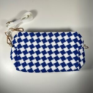 Enter the scene carrying this eye-catching crossbody bag, a symphony of textures and colors that promises to elevate any ensemble. The vibrant blue and white houndstooth pattern, woven from soft tweed, offers a tactile experience that's as pleasing to the touch as it is to the eye. Gold-tone hardware adds a touch of elegance, accentuating the sleek design and the refined aesthetic. Inside, a spacious, lined interior accommodates your essentials, keeping them secure and organized while on the go. The detachable crossbody strap allows for versatile styling, transforming this beauty into a chic clutch for evening events. Ideal for adding a pop of color to a casual brunch, a sophisticated accessory for a gallery opening, or a stylish companion for a weekend getaway.