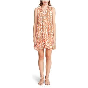 The easy-breeziest. Tropical Breeze is a batik printed crinkle rayon mini dress with a tiered babydoll silhouette. Colors is orange and white/off white. Roomy fit.